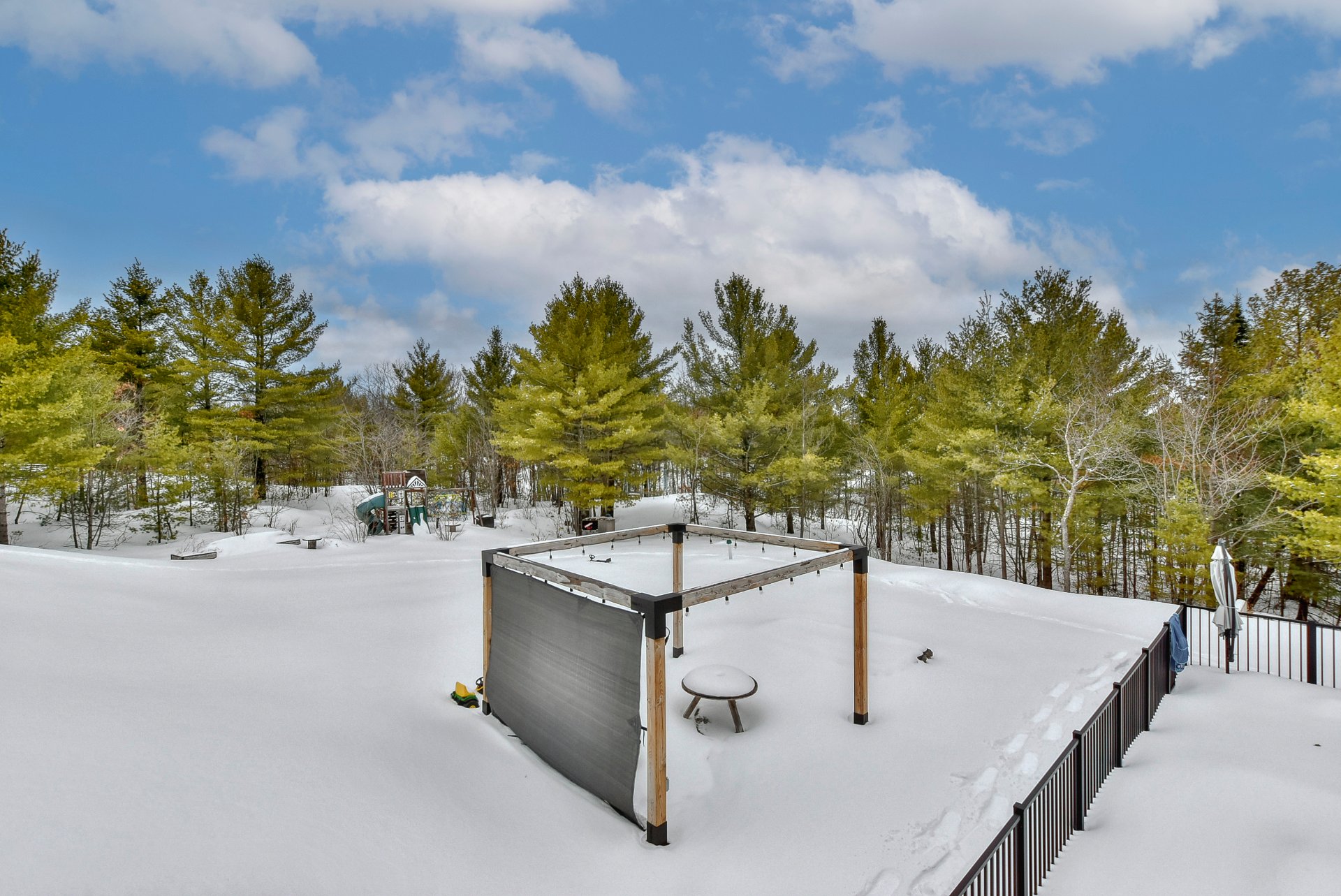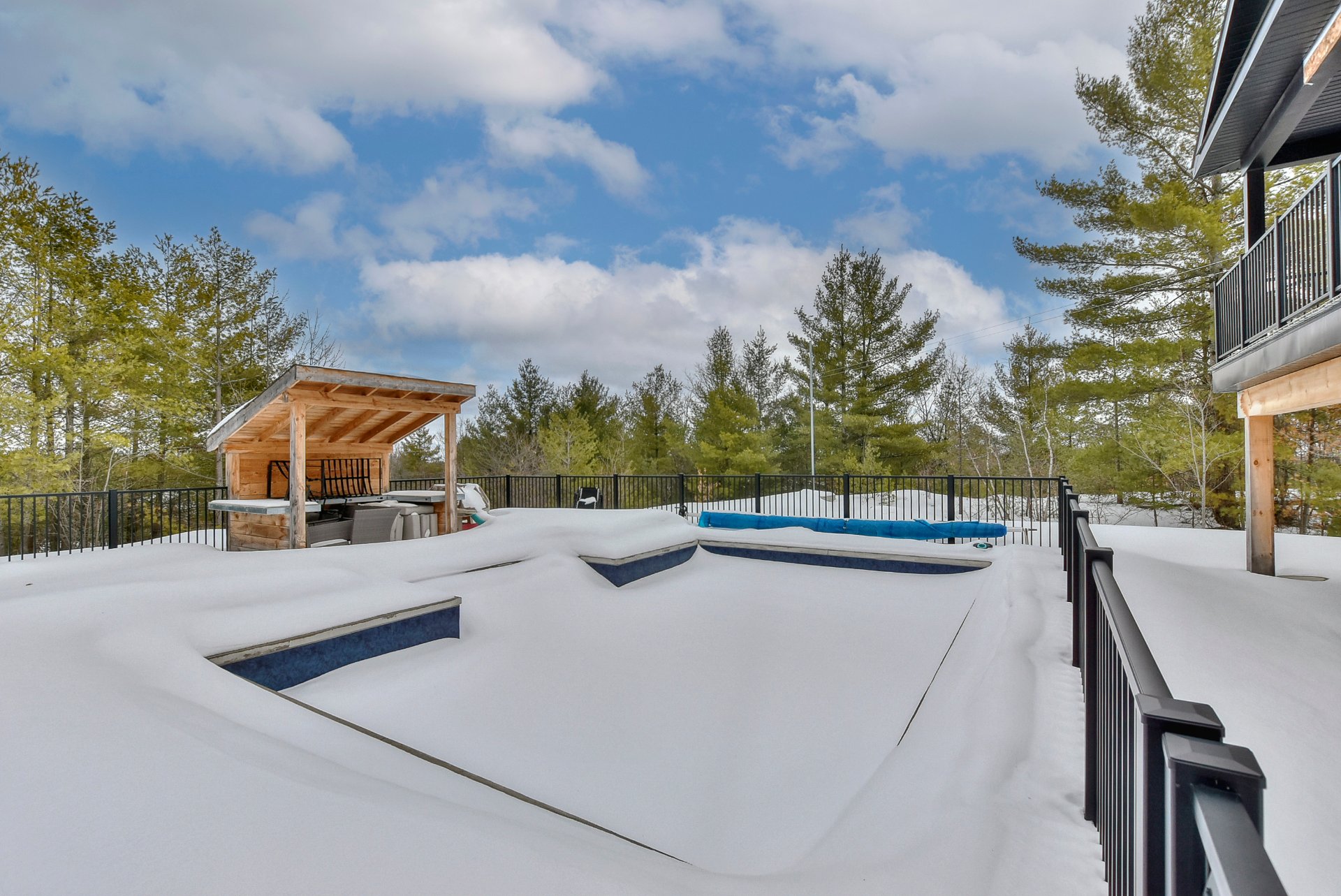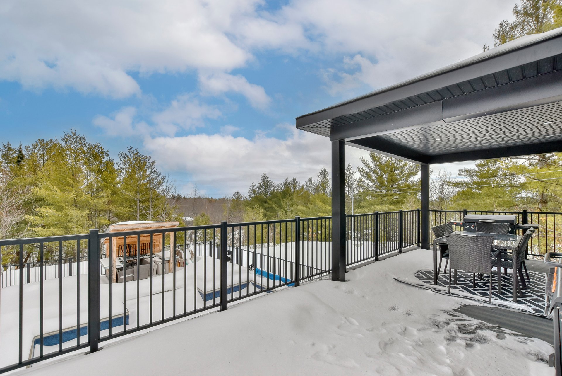 Les installations permanentes de chauffage, d'électricité et d'éclairage, stores, hotte de cuisinière, aspirateur central et accessoires, îlot de cuisine, refroidisseur à vin, adoucisseur d'eau, échangeur d'air, thermopompe centrale, foyer au bois, 2 ouvre portes de garage électrique, module de jeux pour enfants, piscine creusée au sel et accessoires, chauffe piscine, spa.