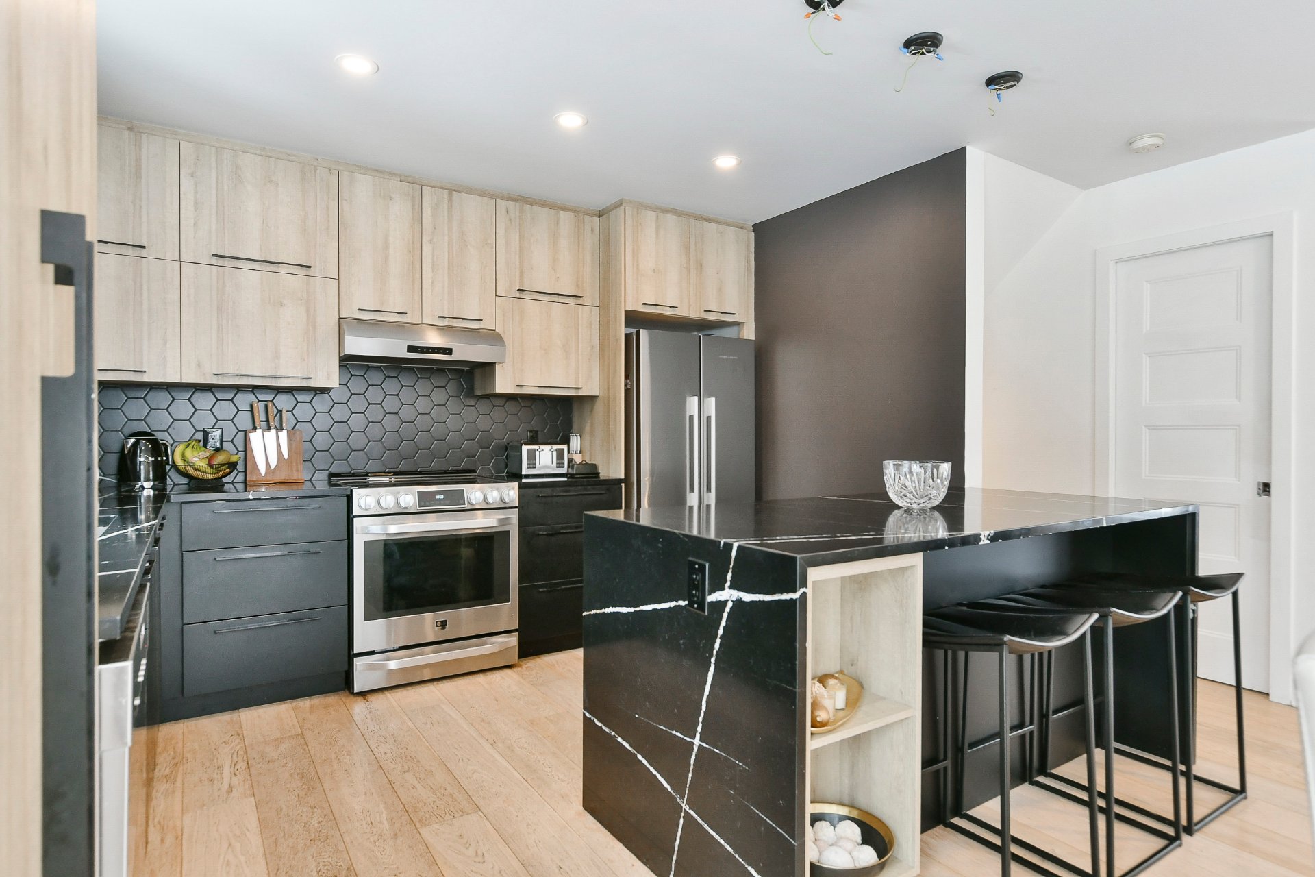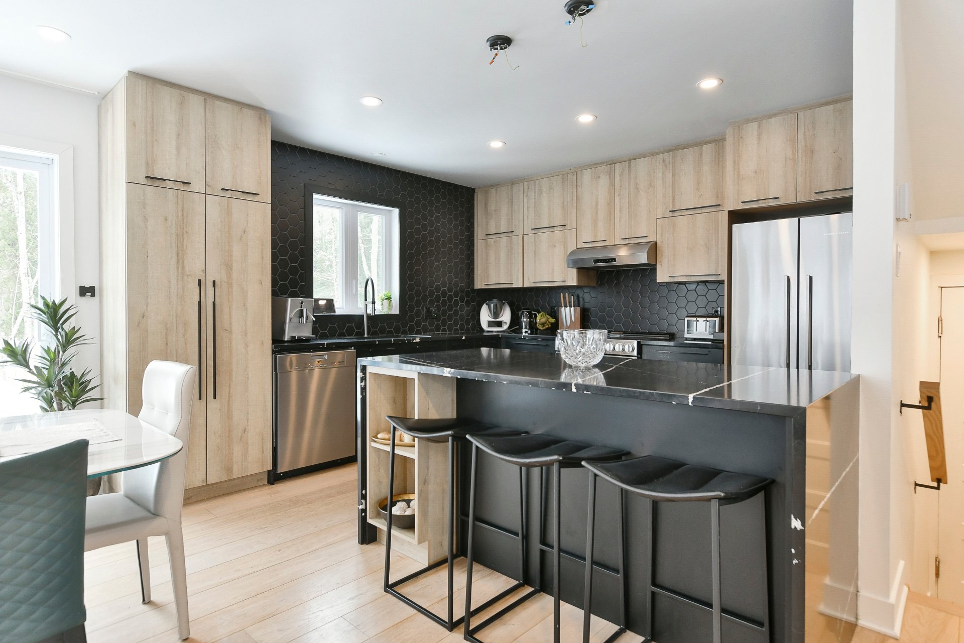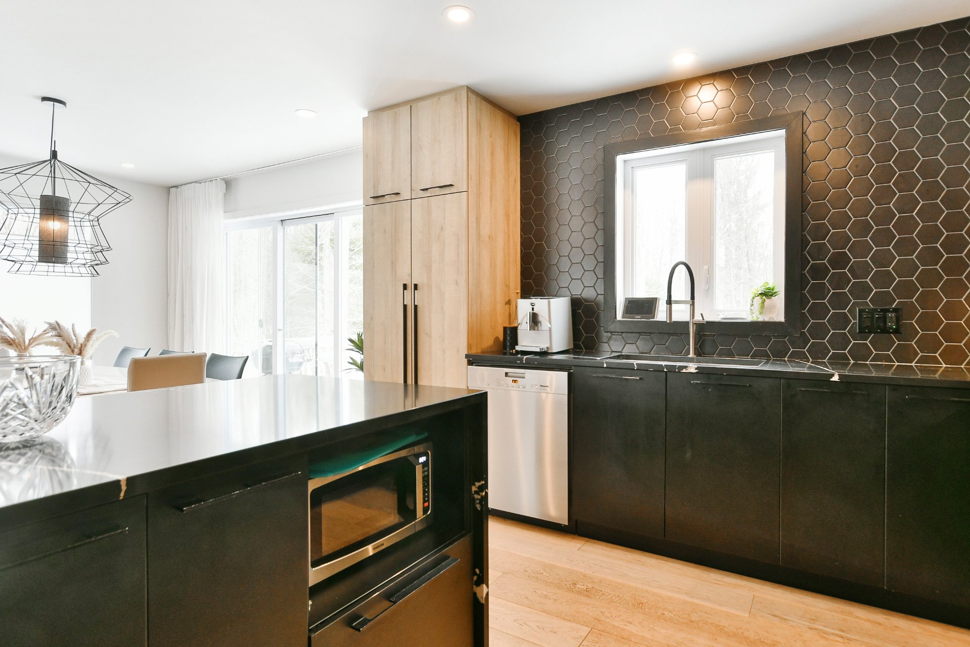 d'un îlot central, de comptoirs en quartz et d'un dosseret