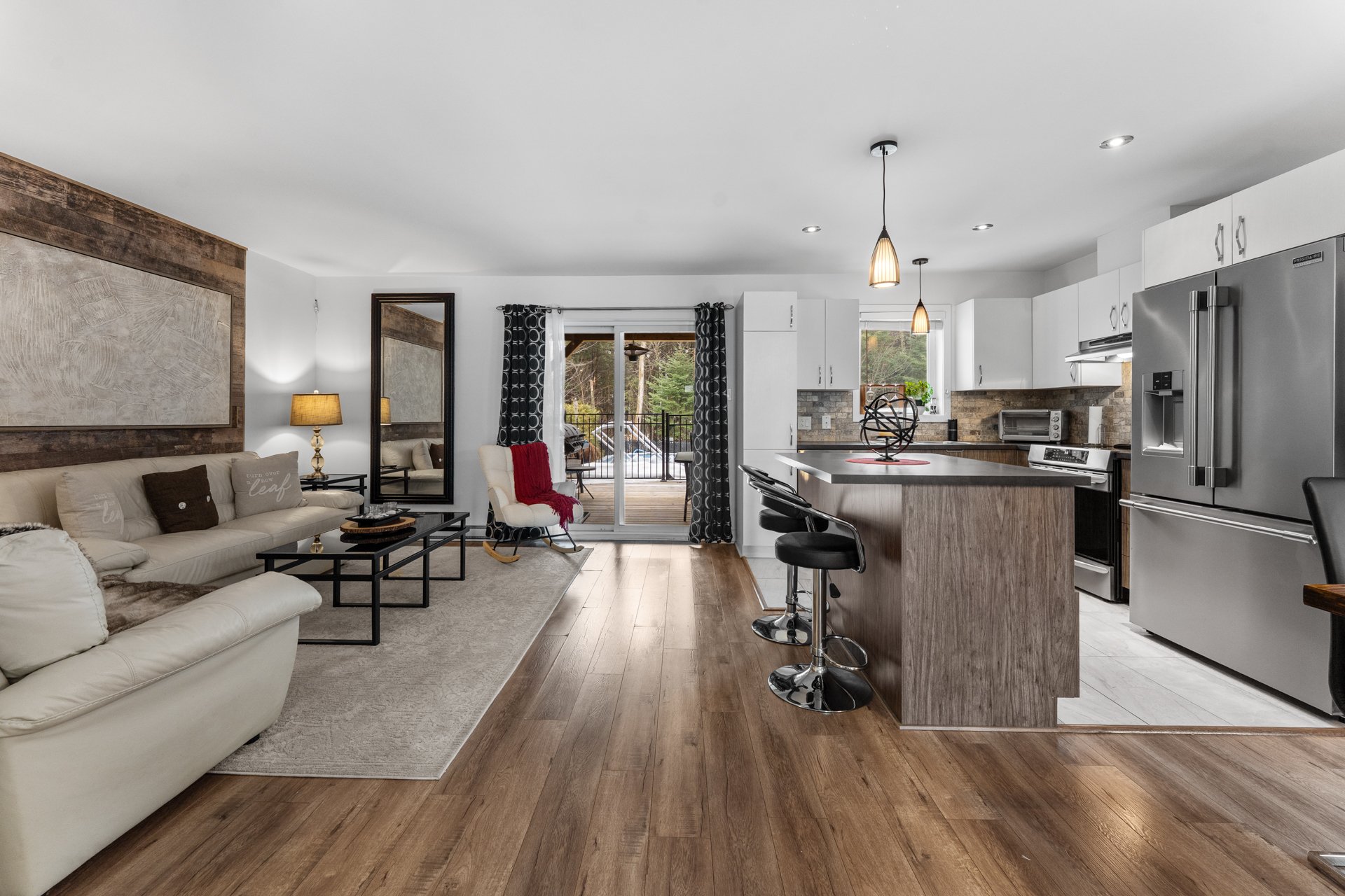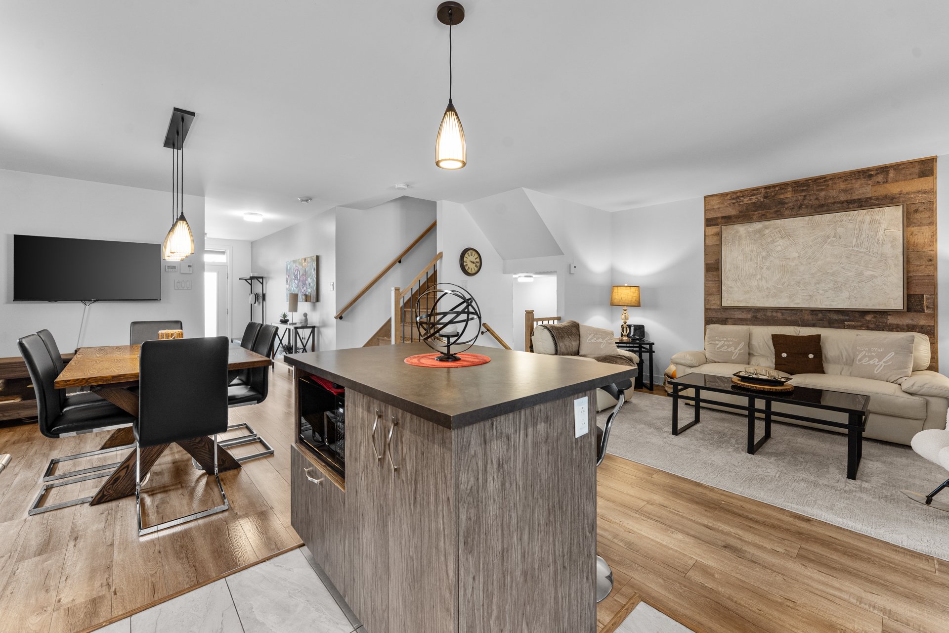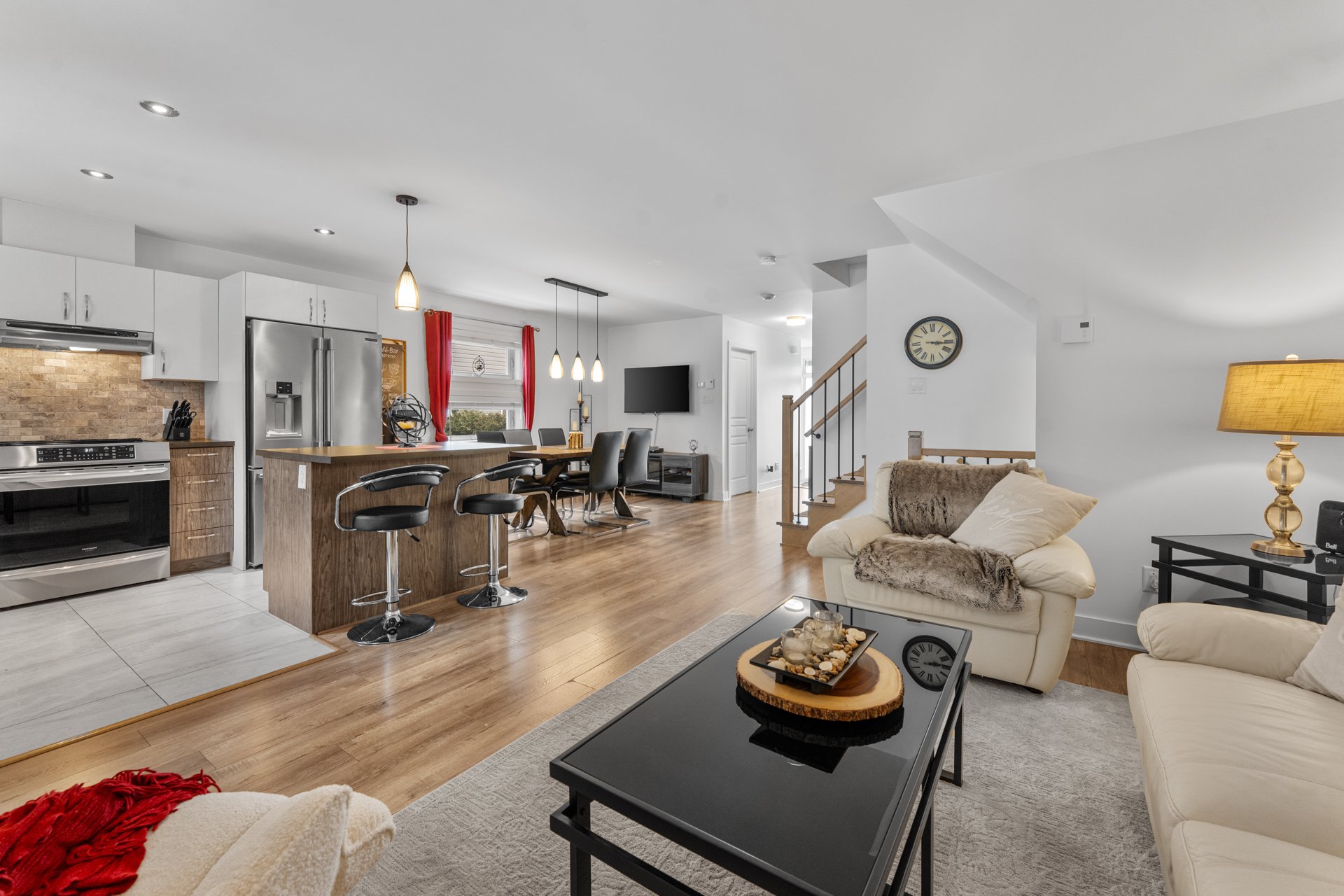 * Aire ouverte spacieuse : cuisine fonctionnelle, salle à