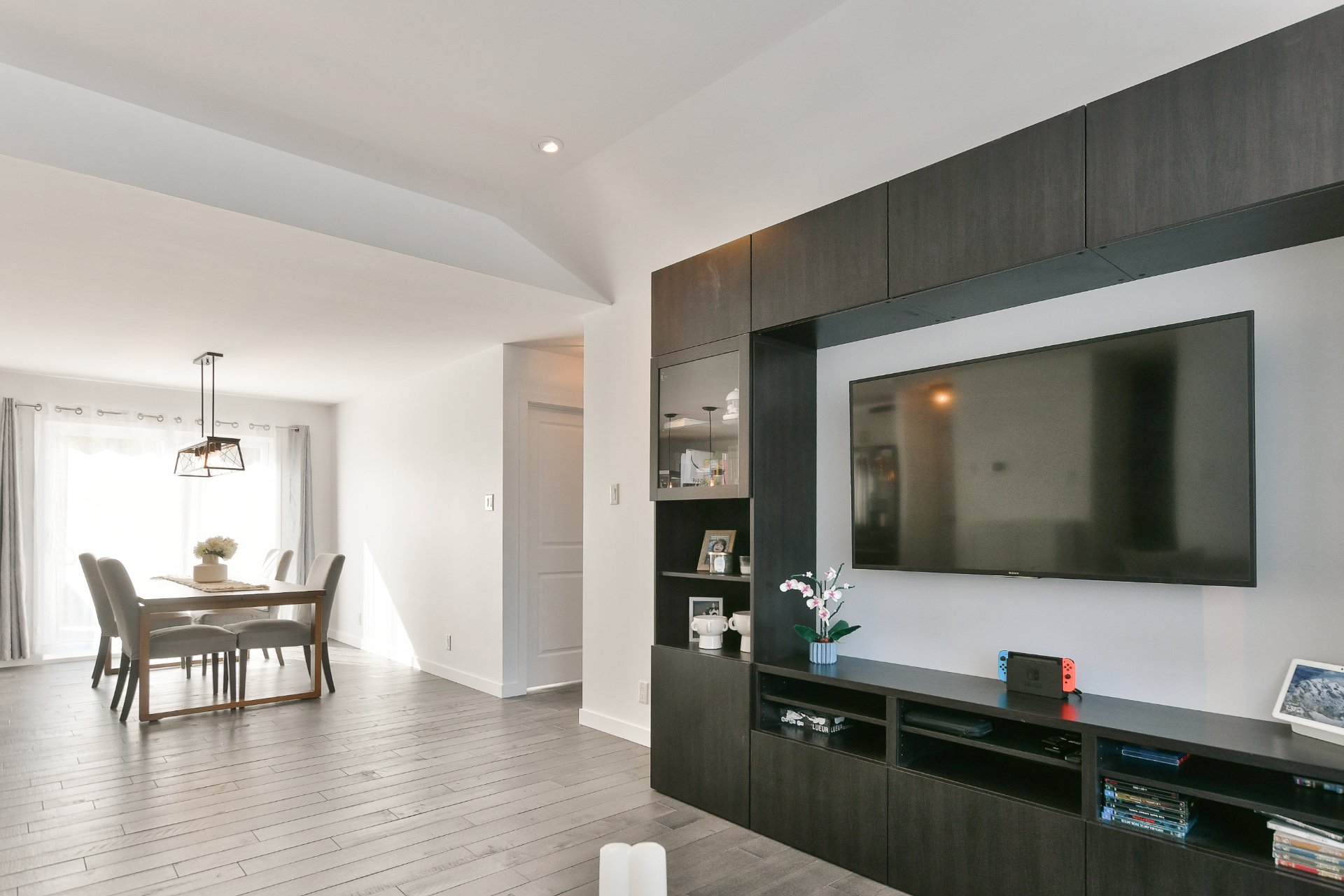 Les installations permanentes de chauffage, d'électricité et d'éclairage, tringles à rideaux, Stores, lave-vaisselle en inox noir, îlot de cuisine, échangeur d'air, thermopompe centrale, gazebo, piscine hors-terre et accessoires et meuble de télé du salon.