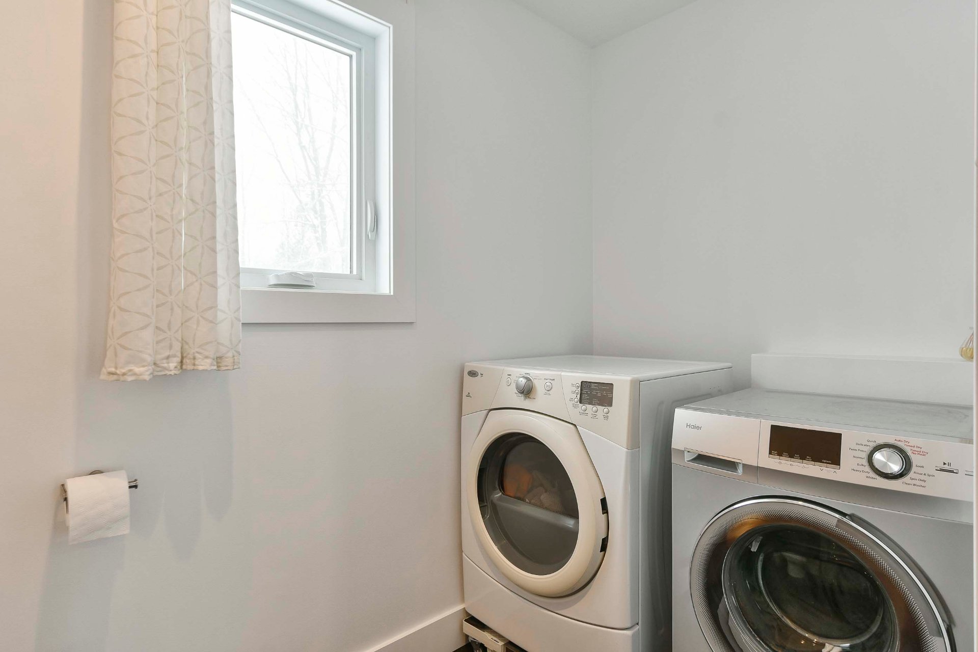 Les installations permanentes de chauffage, d'électricité et d'éclairage, tringles à rideaux, lave-vaisselle blanc, hotte en inox, îlot de cuisine, sonnette avec caméra, lampe uv, thermopompe avec 3 sorties et poêle au bois (débranché).