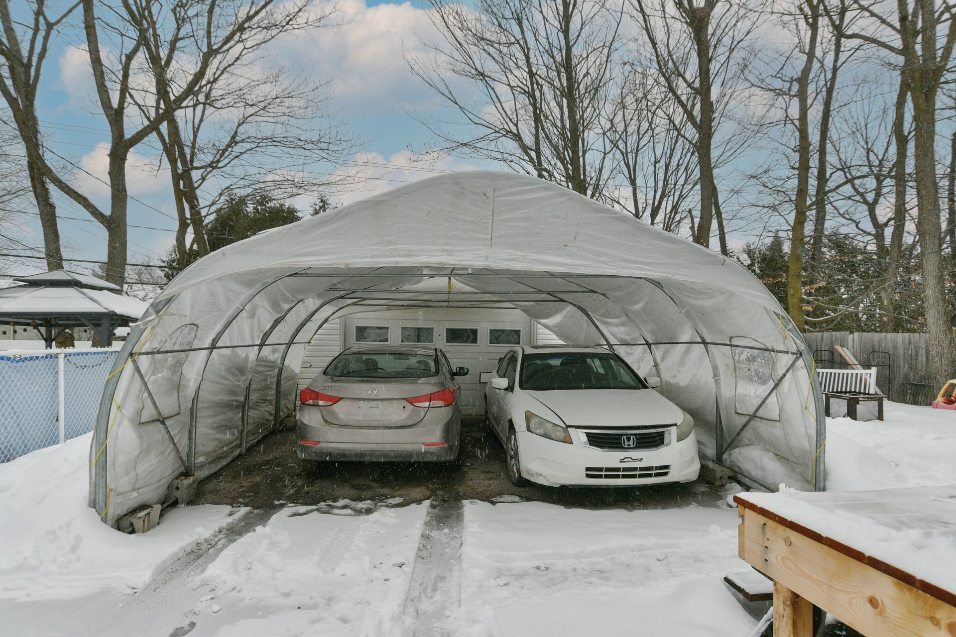 Élévateur automobile du garage, meubles et effets personnels des vendeurs et téléviseur du salon.