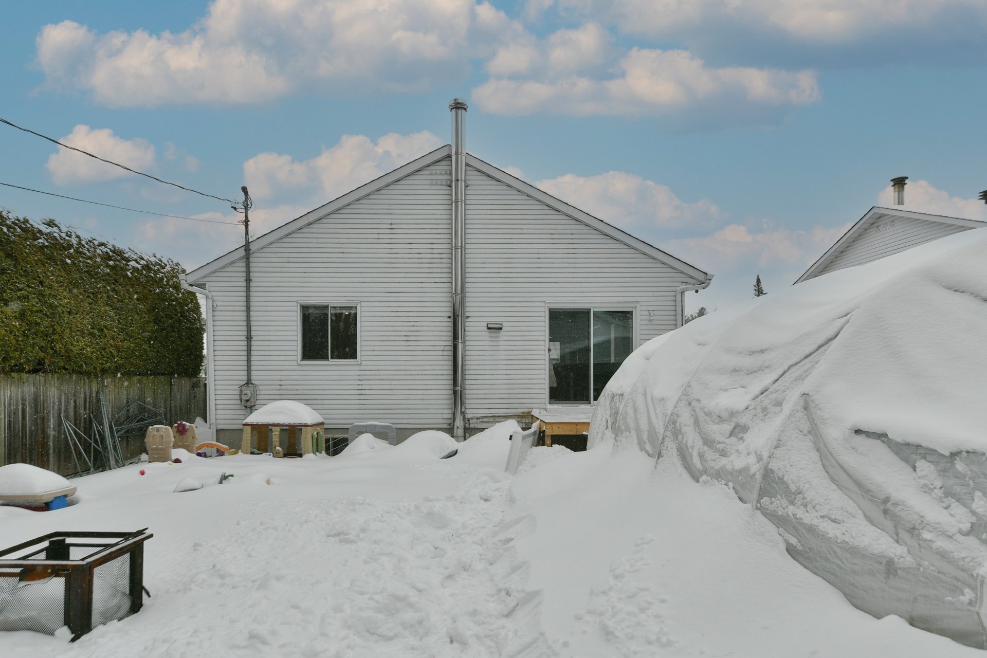 Luminaires, Stores, Rideaux, thermopompe murale, réfrigérateur, laveuse et sécheuse, lave-vaisselle, four, aspirateur central et ses accessoires, système d'alarme non relié à la central, système de caméras, sonnette avec caméra non fonctionnelle, adoucisseur d'eau (non fonctionnelle), poêle à bois, cabanon, support mural de la télévision, abris tempo