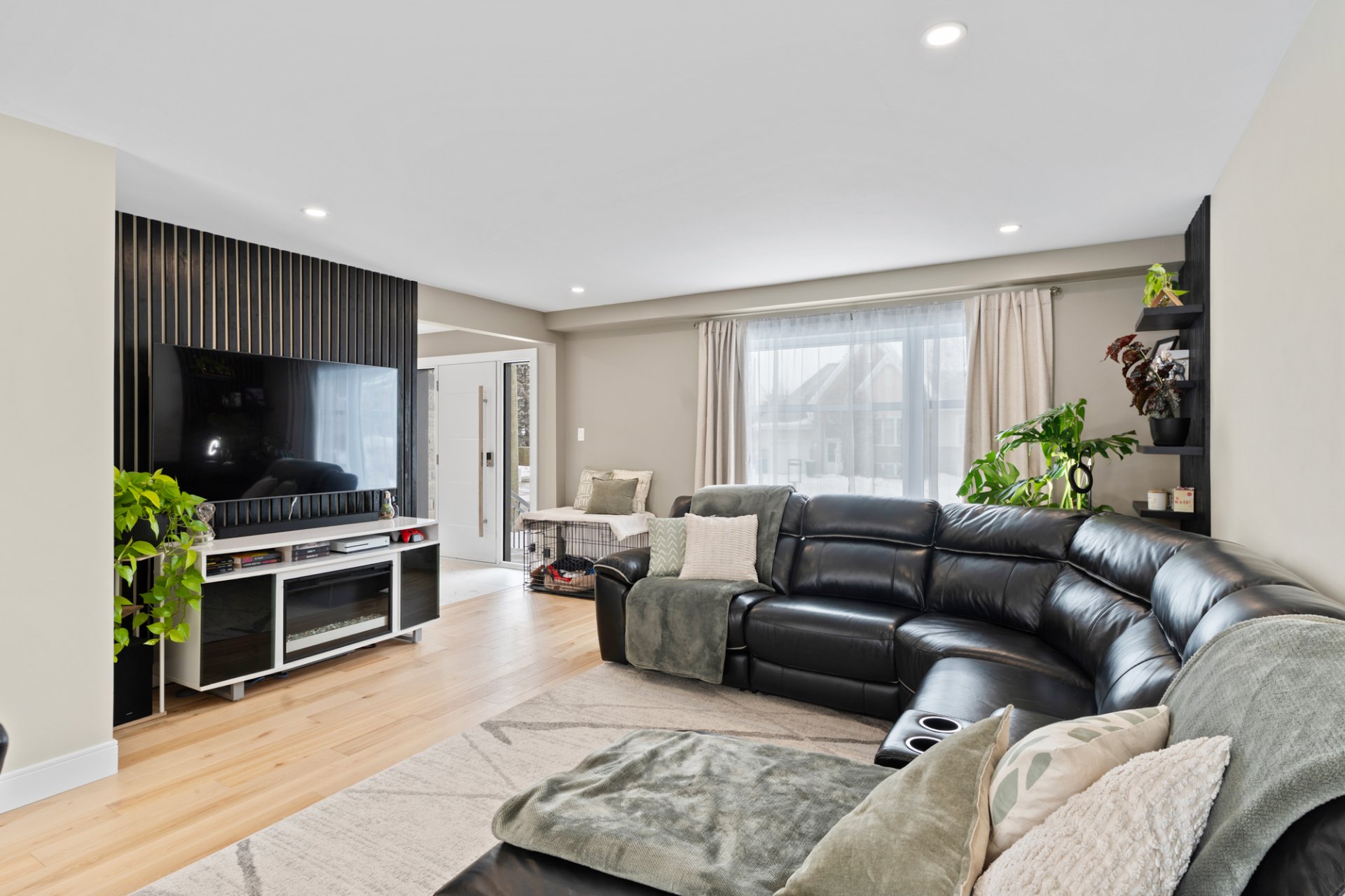 Fixtures électriques, tringles à rideaux, rideaux, lave-vaisselle, hotte cuisinière, balayeuse centrale et accessoires, système de caméra (3), sonnette avec caméra, Domotique (porte de garage, porte de façade, thermostat du chauffage), thermopompe centrale, moteur porte de garage, supports de TV (salon et chambre)