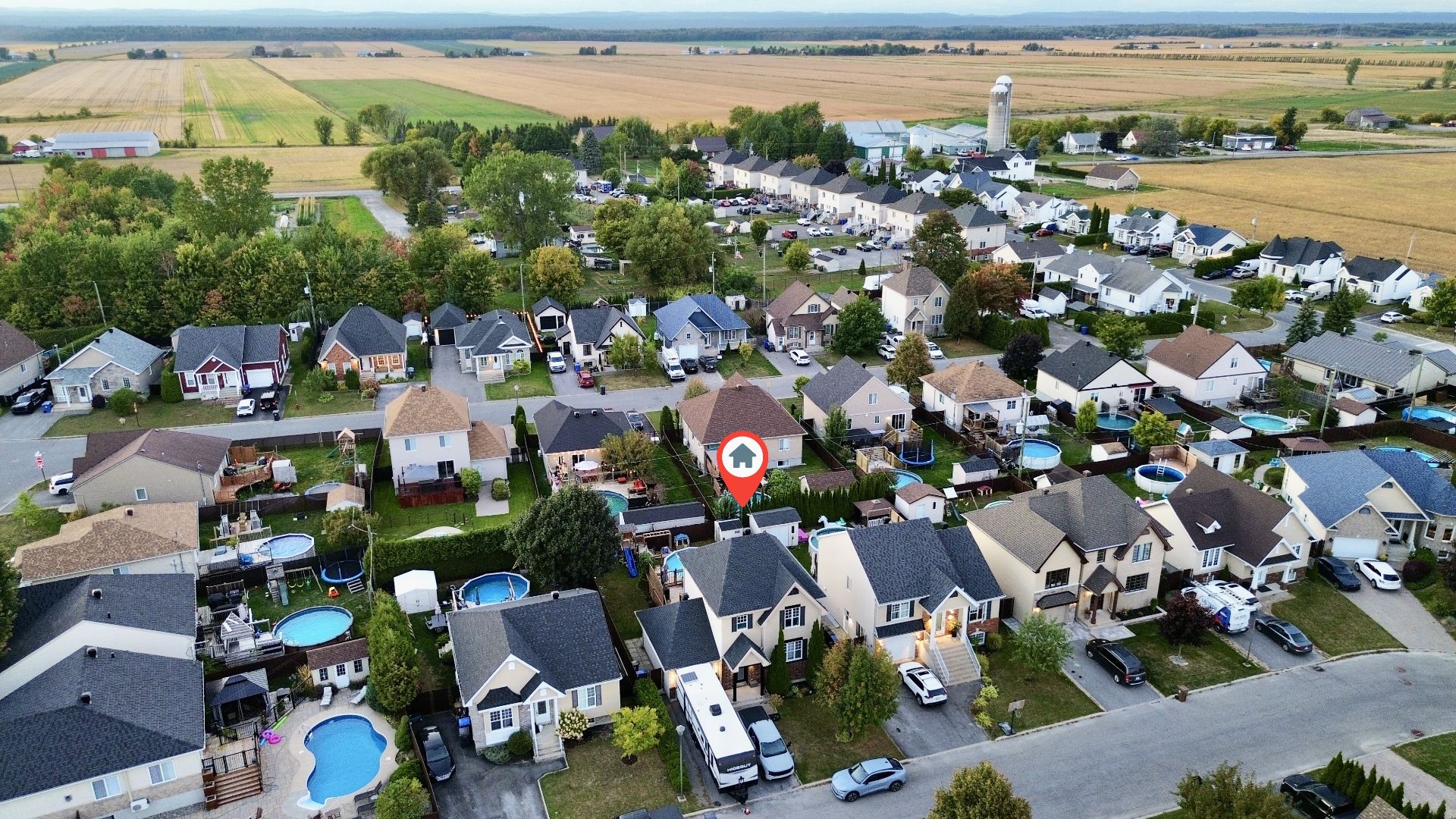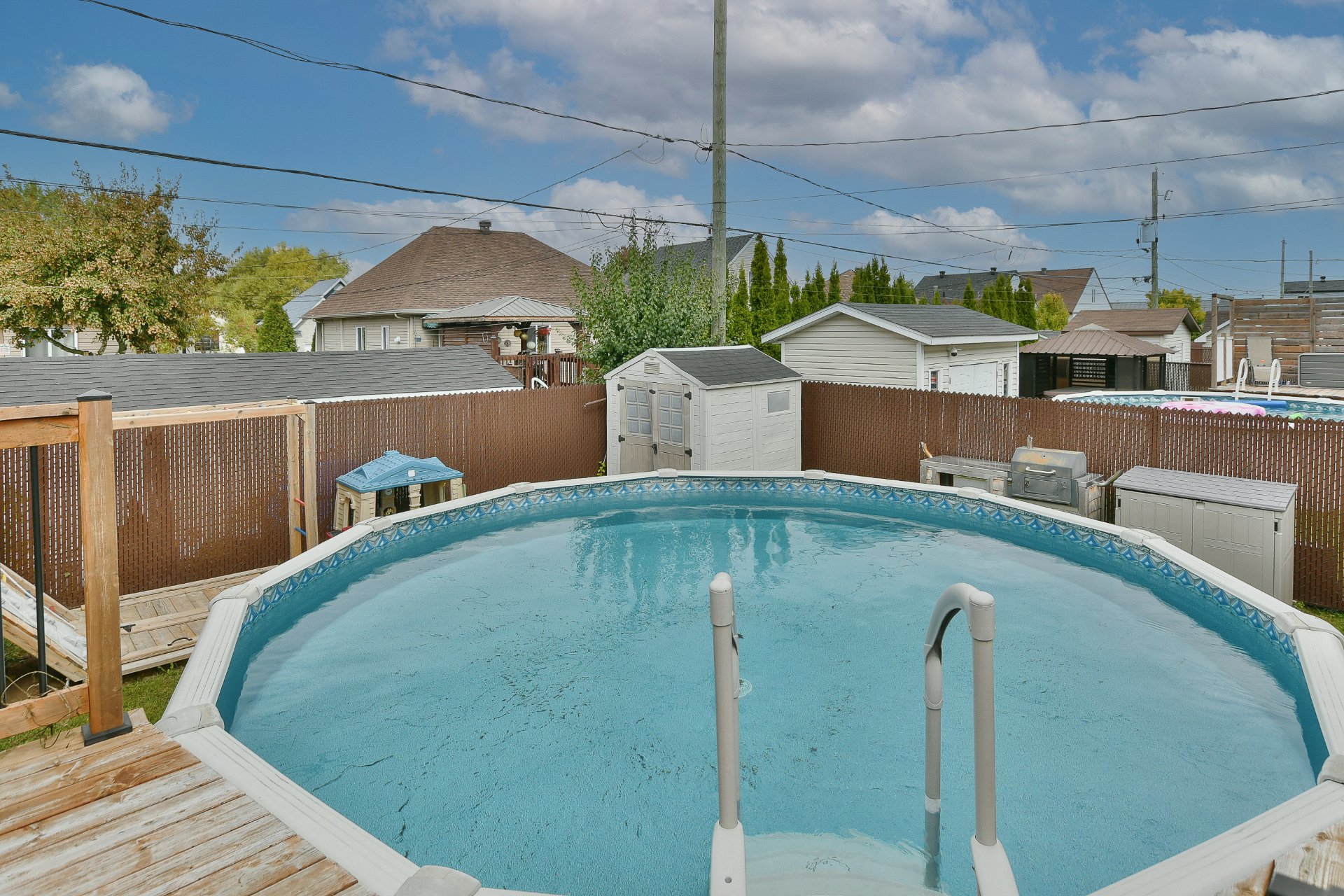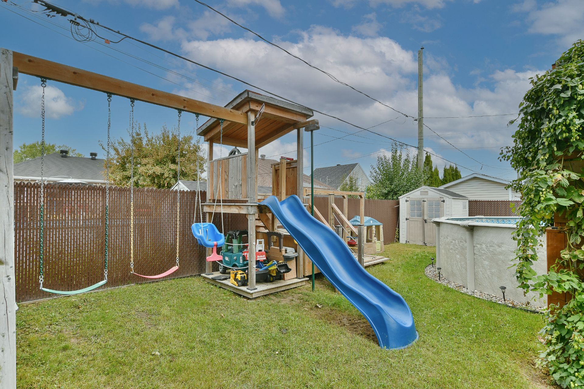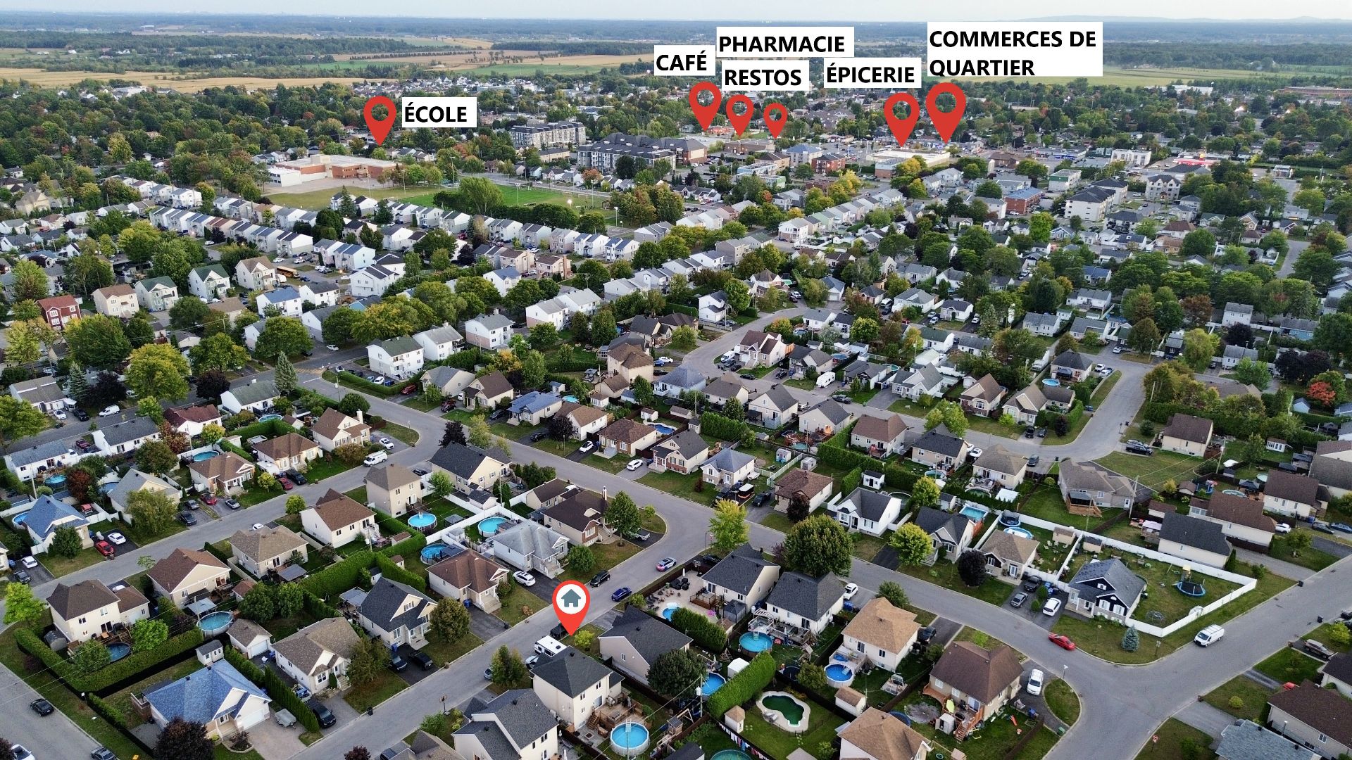 Les installations permanentes de chauffage, d'électricité et d'éclairage, trigles à rideaux, stores, lave-vaisselle en inox, hotte en inox, îlot de cuisine, sonnette avec caméra, adoucisseur d'eau, thermopompe centrale, thermopompe murale, foyer électrique, ouvre-porte de garage (à réparer), cabanon, module de jeux pour enfant, piscine hors terre et accessoires, borne de recharge pour voiture électrique, système d'alarme et meubles télé.