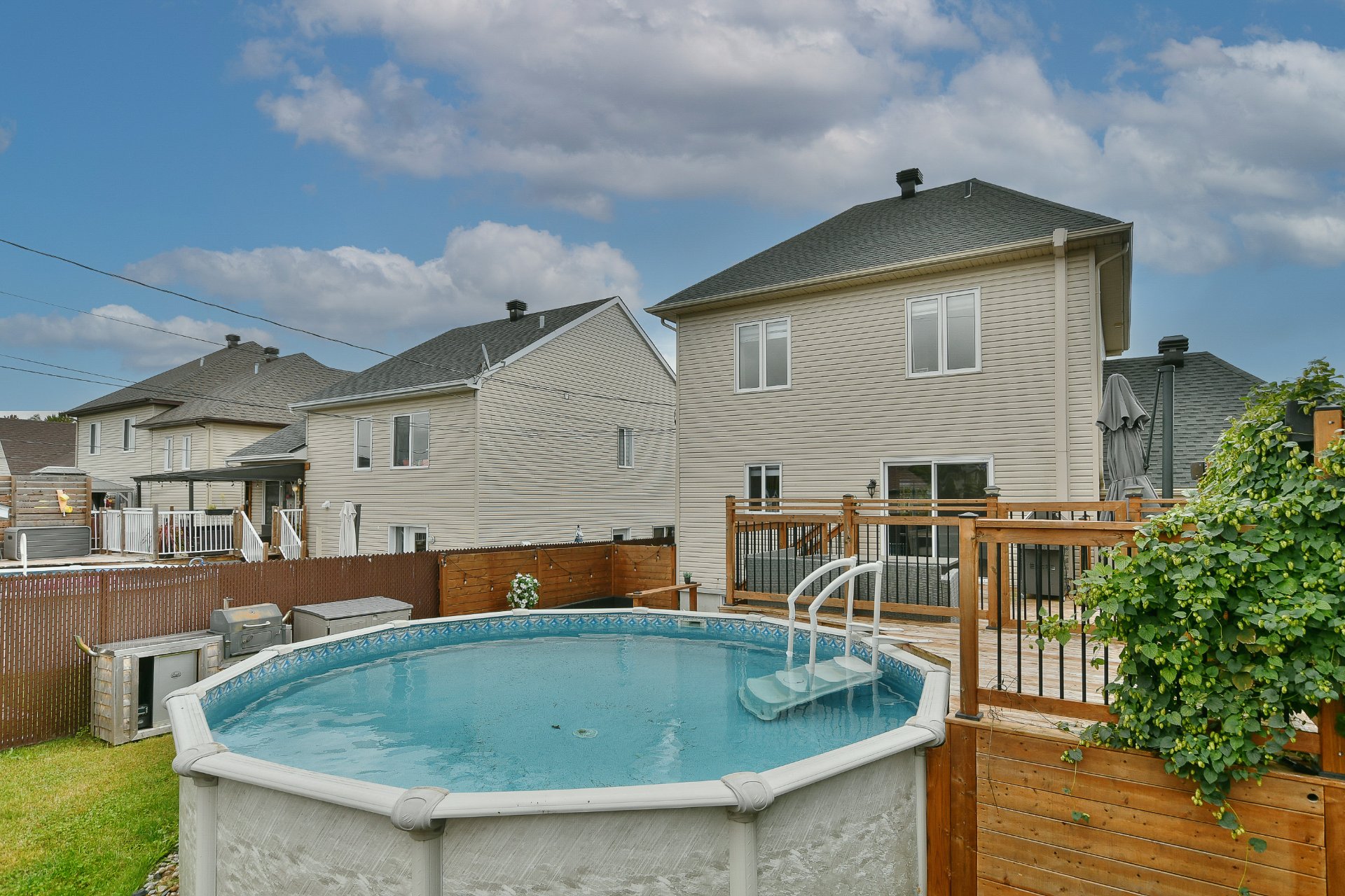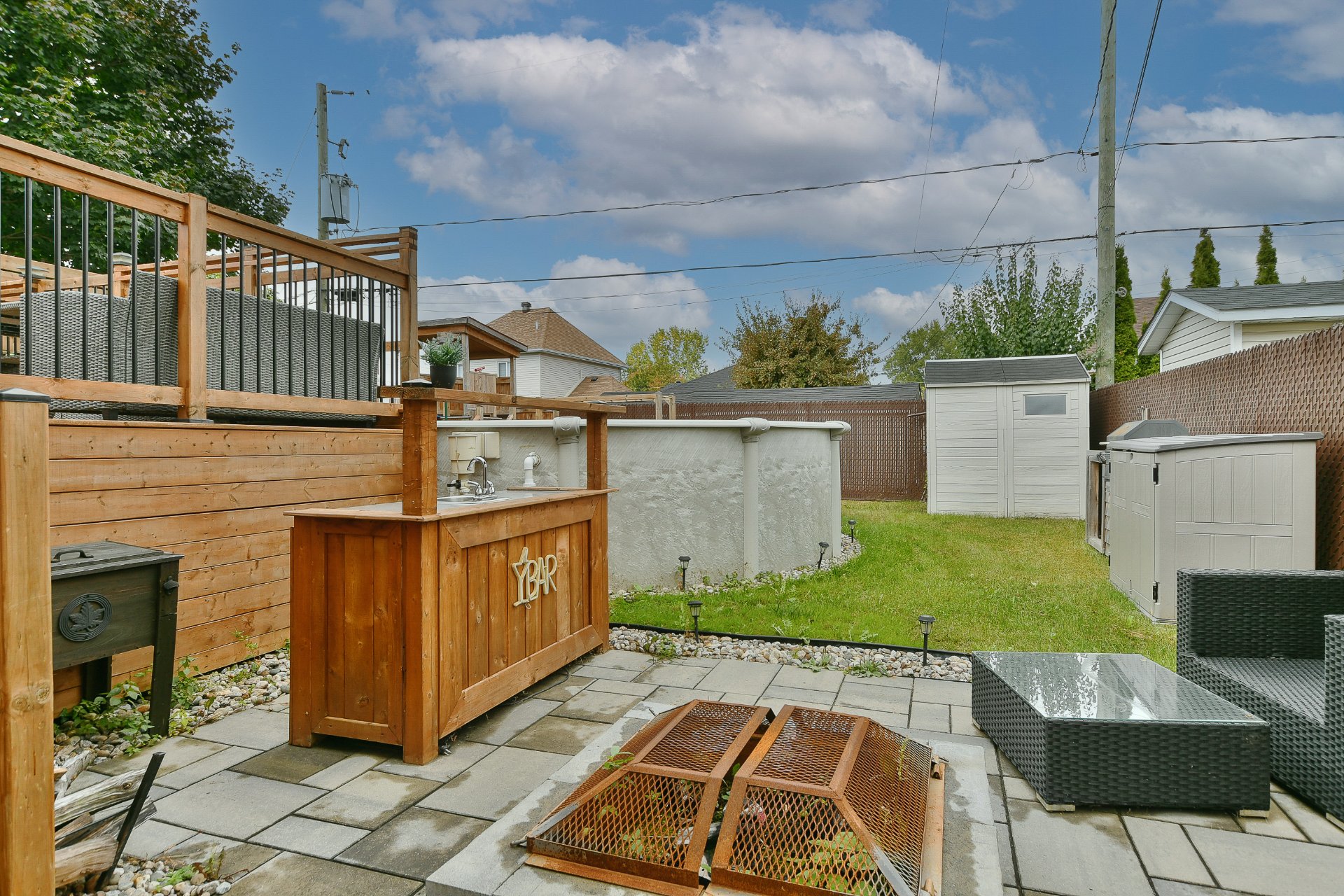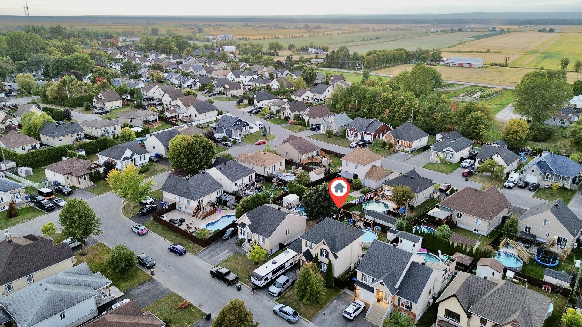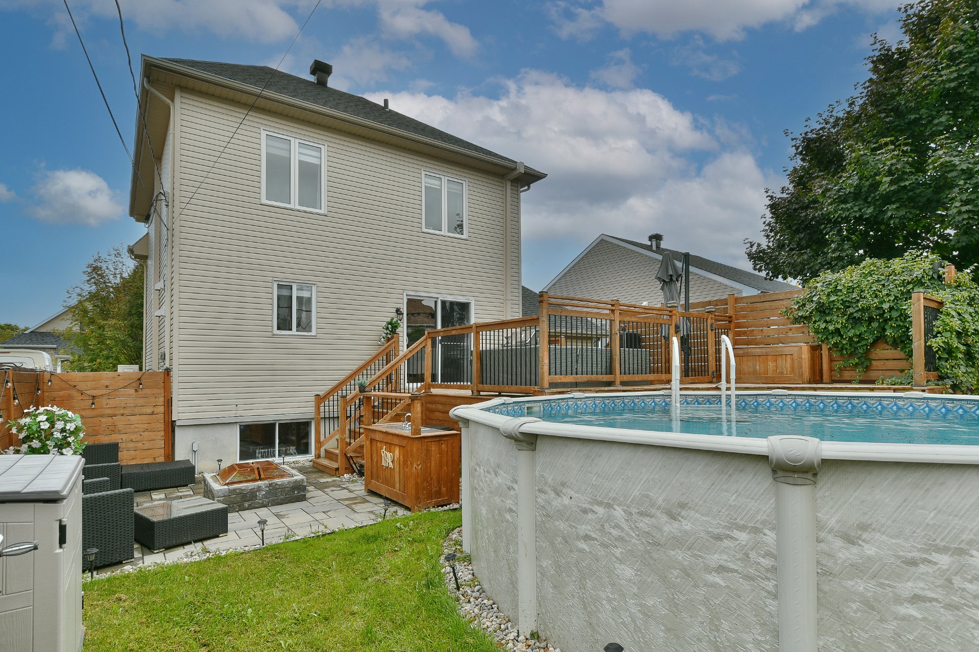 Les installations permanentes de chauffage, d'électricité et d'éclairage, trigles à rideaux, stores, lave-vaisselle en inox, hotte en inox, îlot de cuisine, sonnette avec caméra, adoucisseur d'eau, thermopompe centrale, thermopompe murale, foyer électrique, ouvre-porte de garage (à réparer), cabanon, module de jeux pour enfant, piscine hors terre et accessoires, borne de recharge pour voiture électrique, système d'alarme et meubles télé.