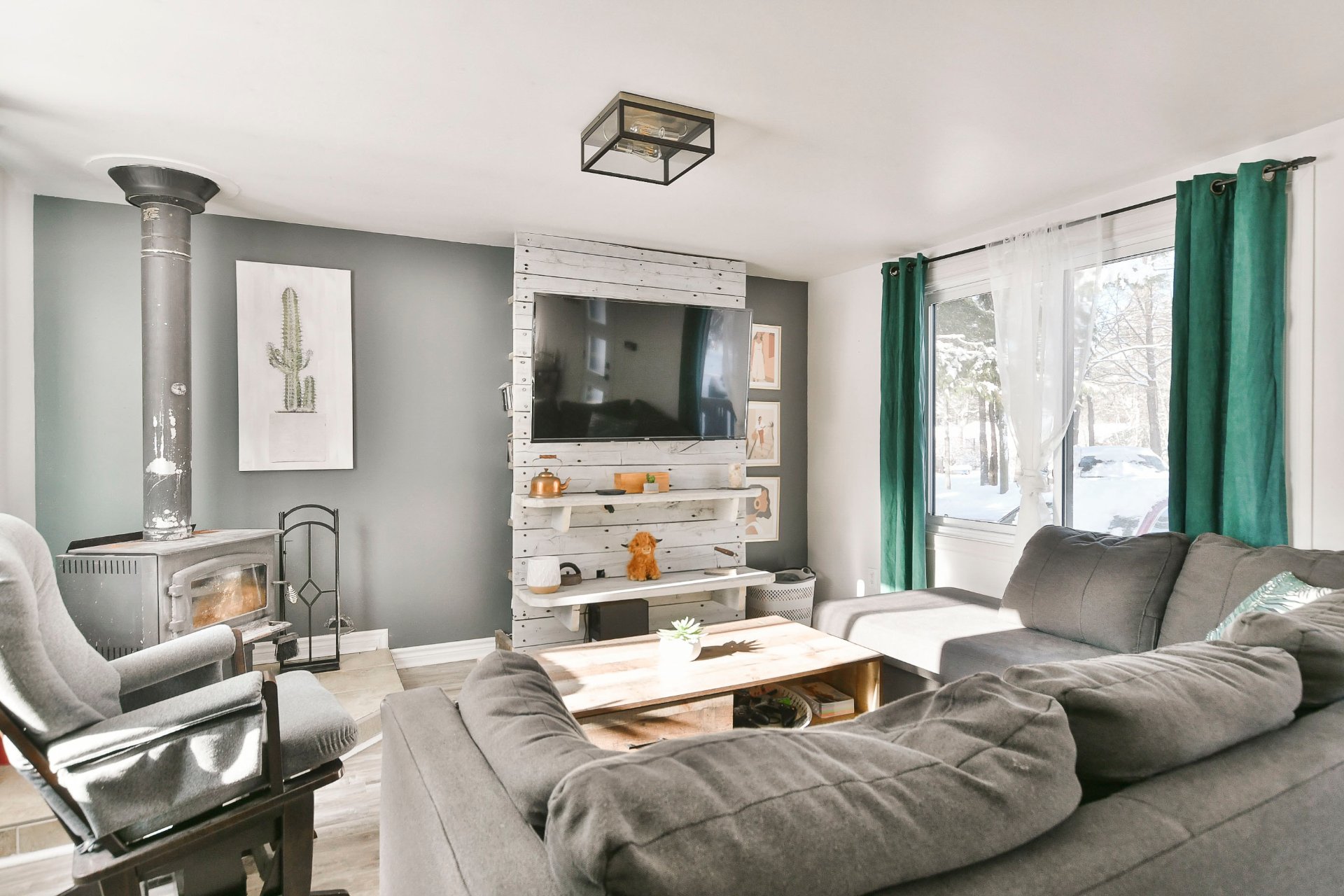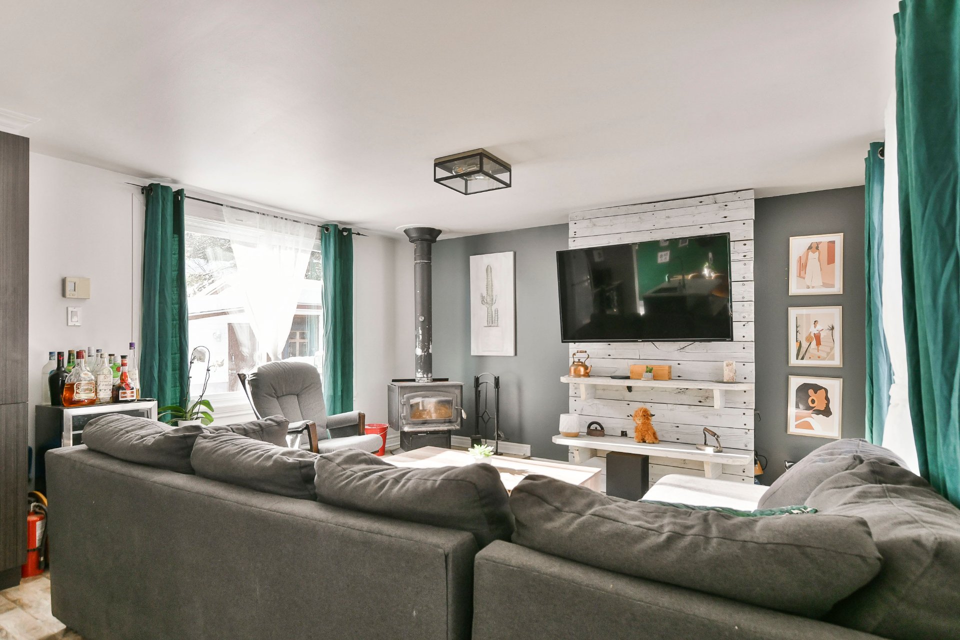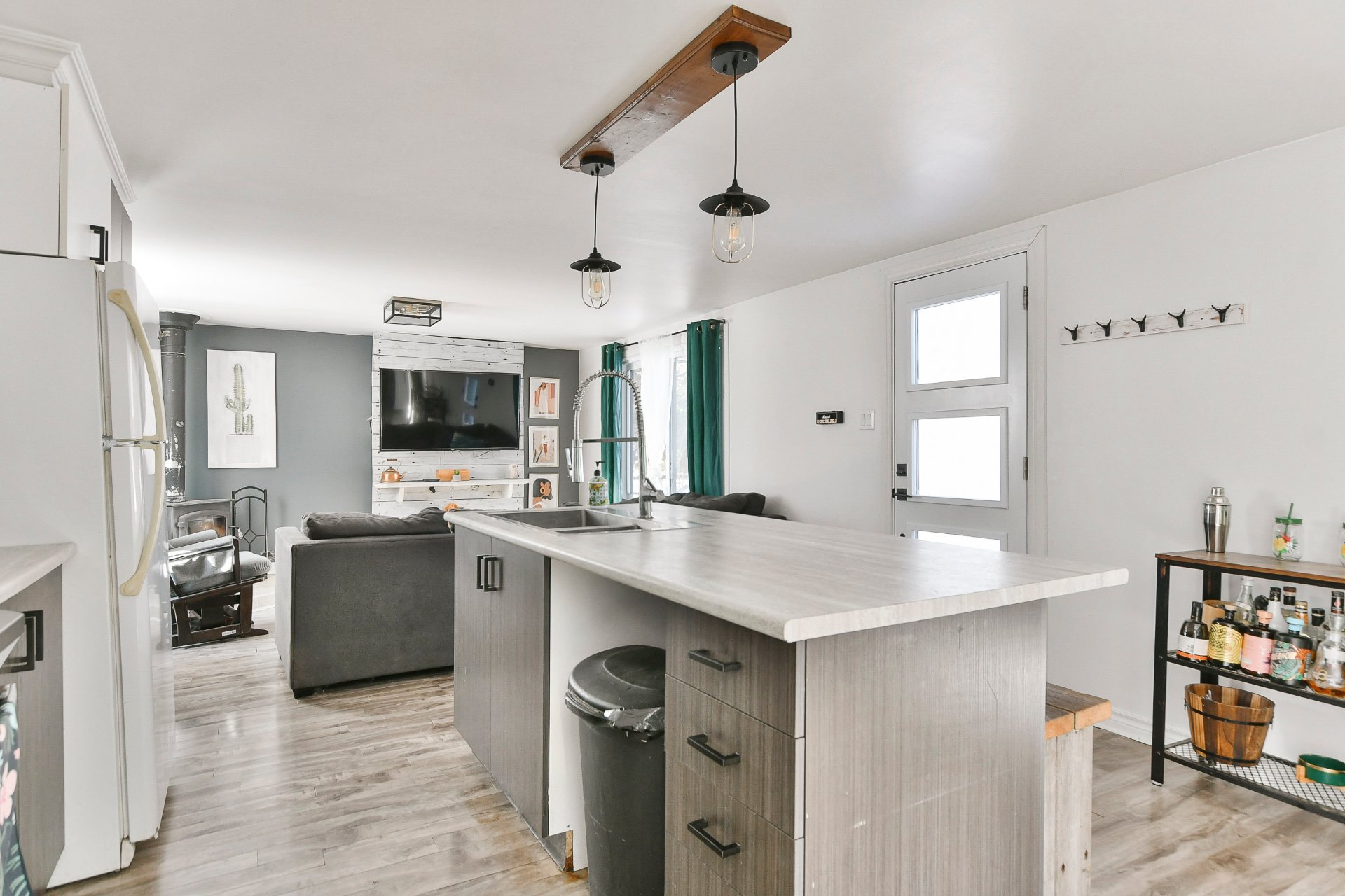 Fixtures électriques, pôles à rideaux, rideaux, îlot de cuisine, banc du îlot, poêle à bois, 2 cabanons, bacs à fleur