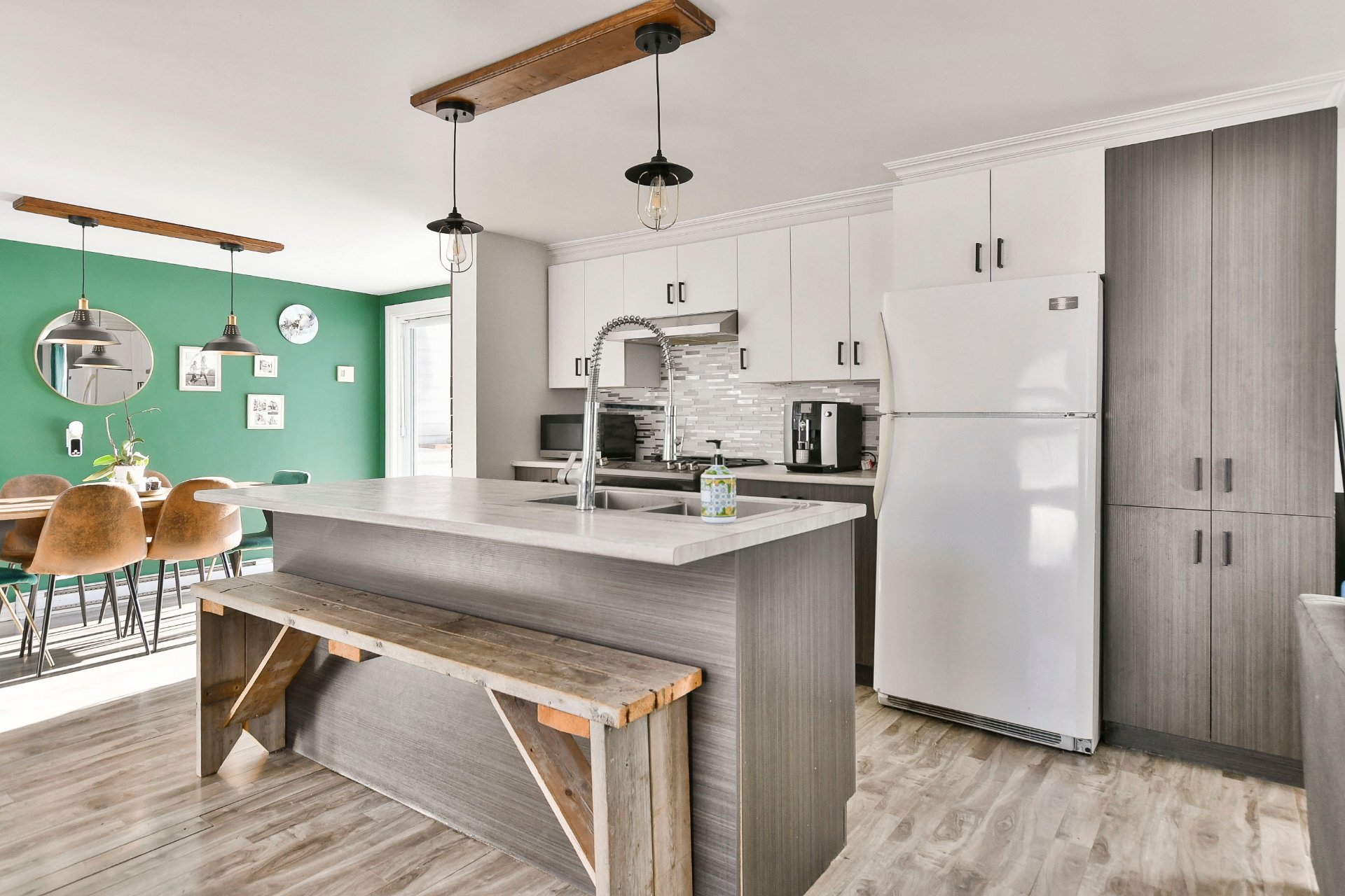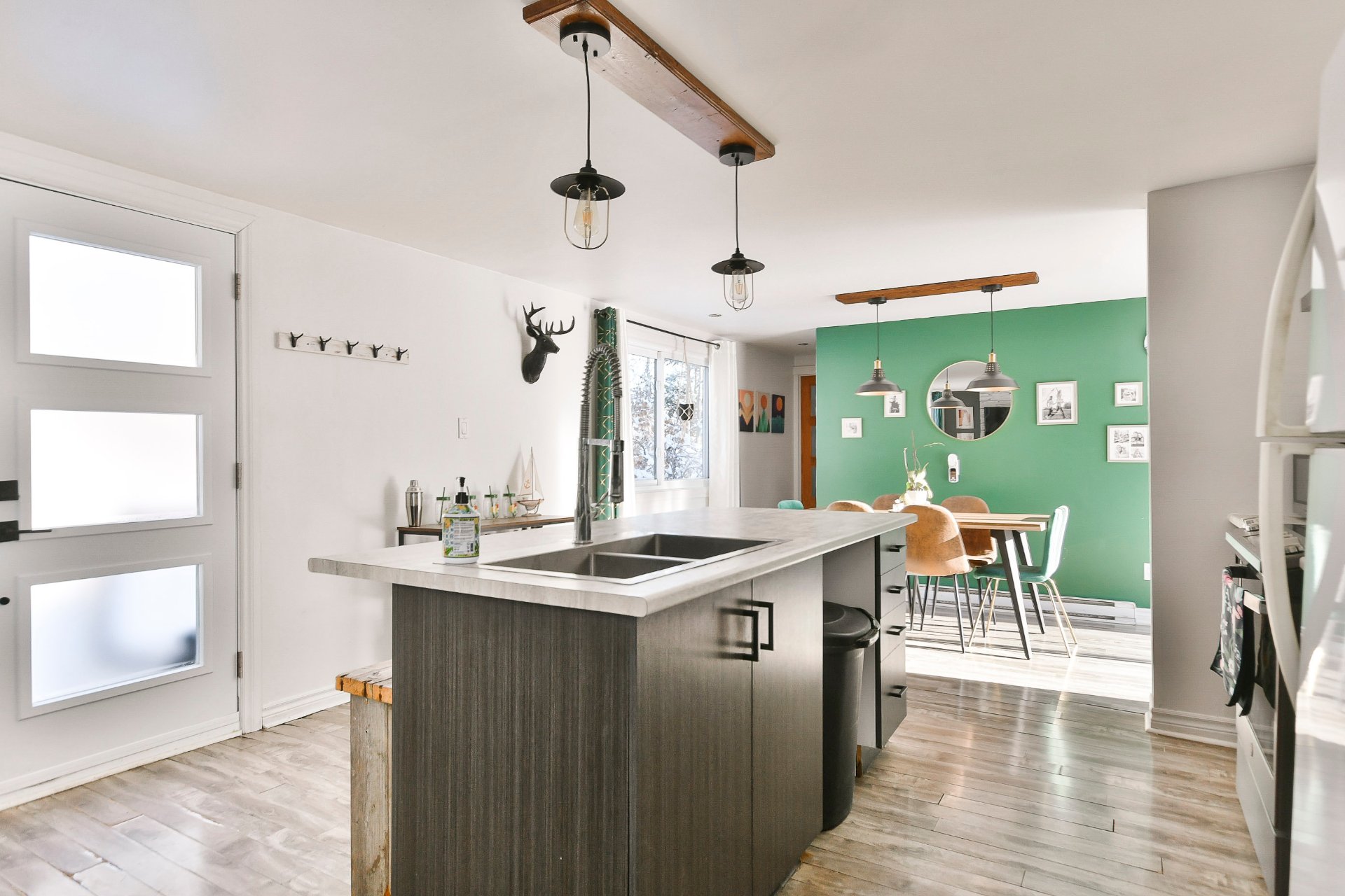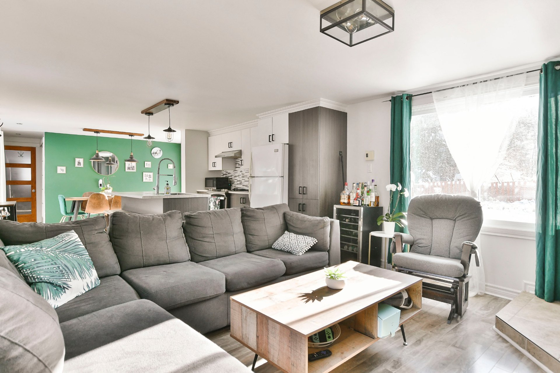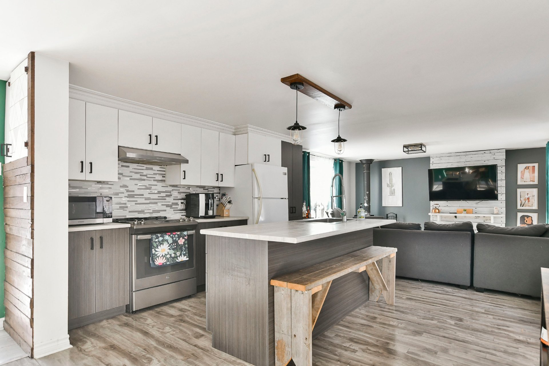Fixtures électriques, pôles à rideaux, rideaux, îlot de cuisine, banc du îlot, poêle à bois, 2 cabanons, bacs à fleur