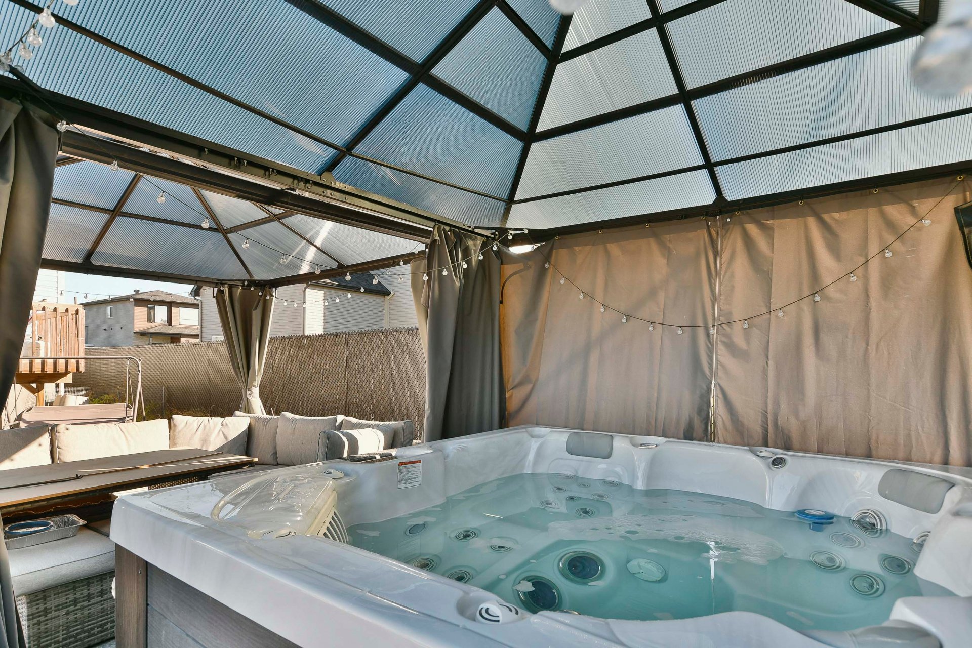 Lave-vaisselle en inox Mair, abri pour spa, spa, remise, caméras, borne voiture électrique, 3 téléviseurs & supports muraux.