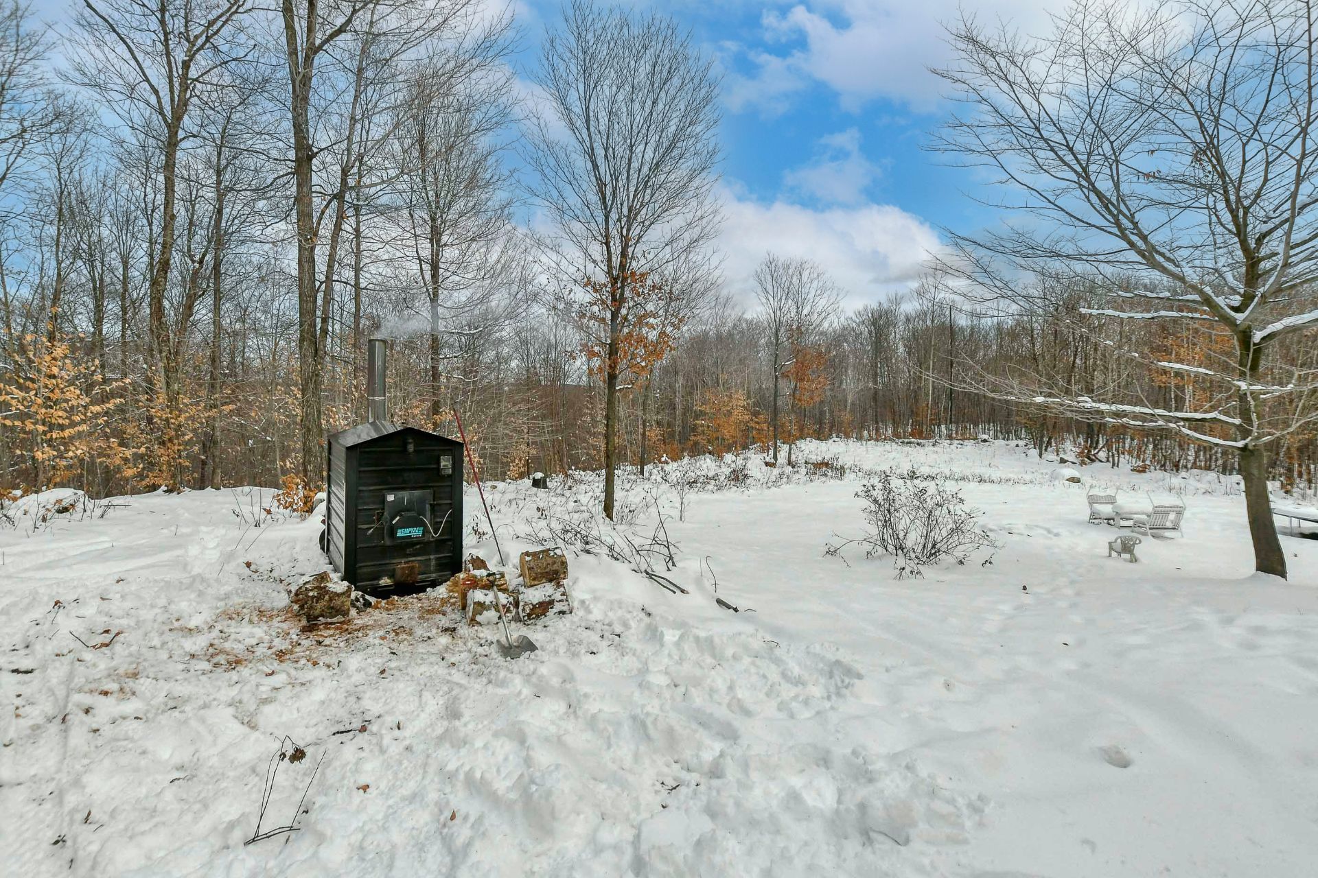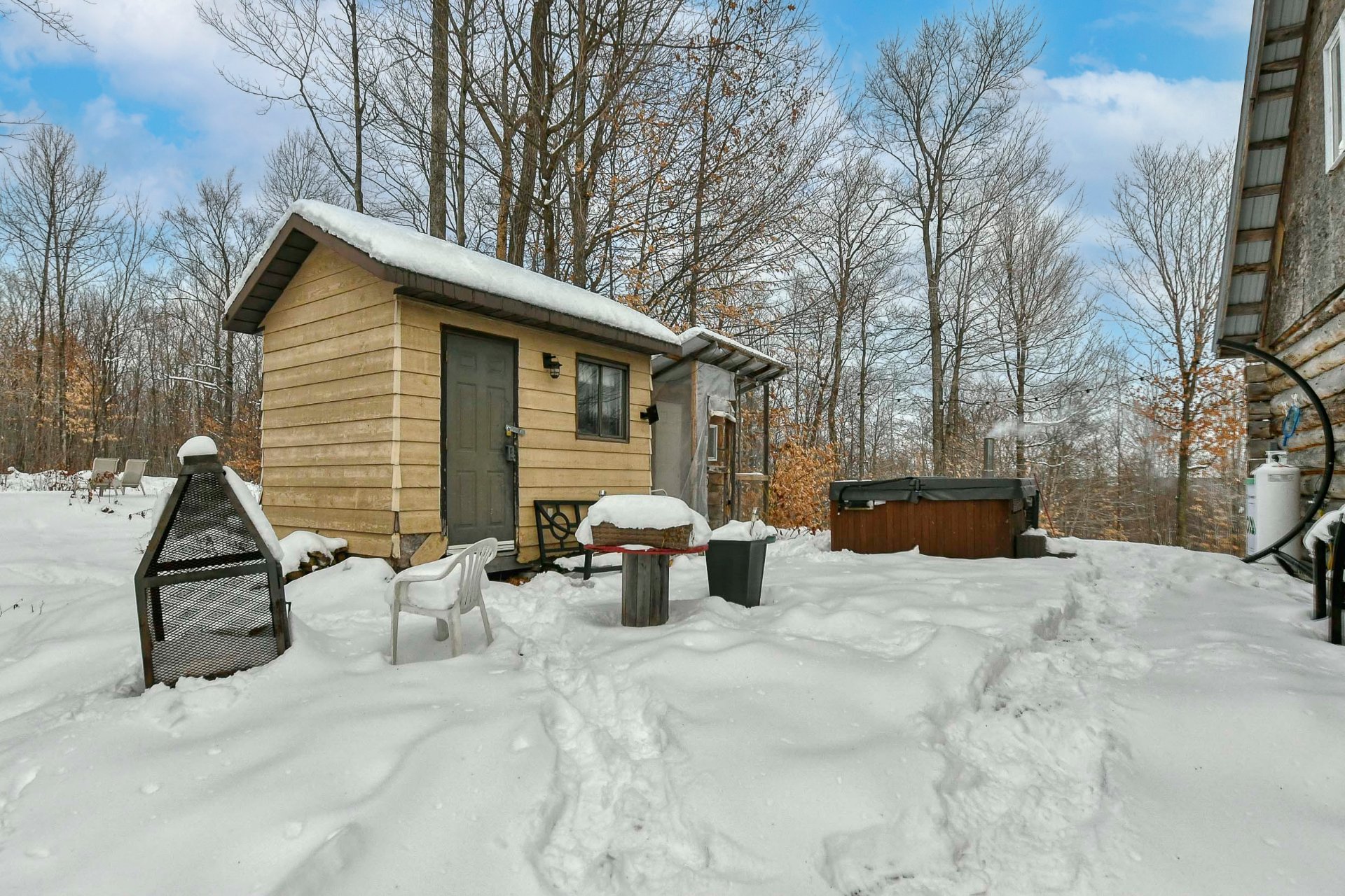 Les installations permanentes de chauffage, d'électricité & d'éclairage, tringles à rideaux, stores, îlot de cuisine, aspirateur central & accessoires, fournaise extérieure au bois, poulailler, cabanon, piscine hors-terre & accessoires, borne de voiture électrique.