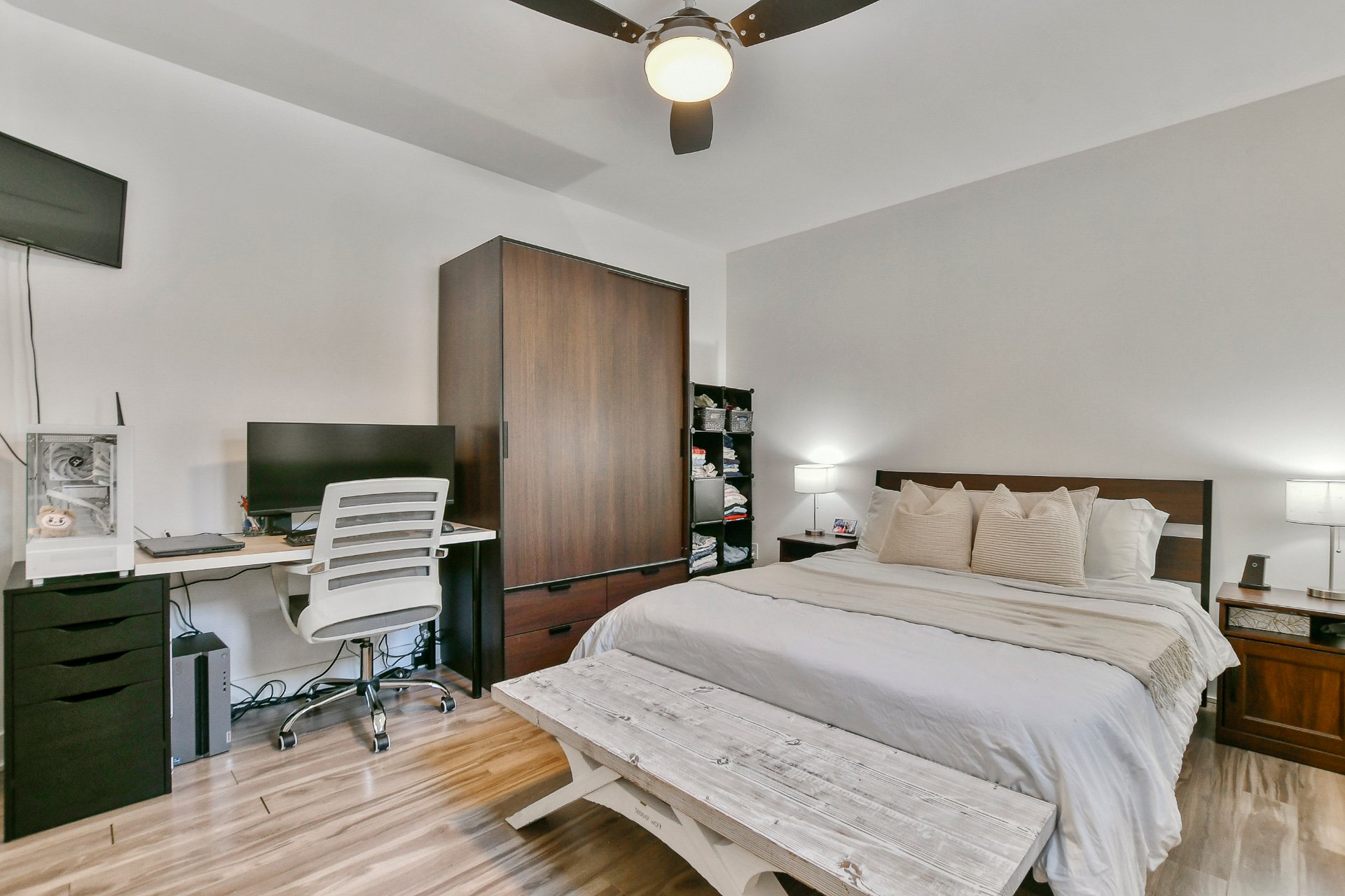 Fixtures électriques, tringles à rideaux, stores, lave vaisselle, échangeur d'air, thermopompe murale, téléviseur et support mural dans la chambre des maîtres.